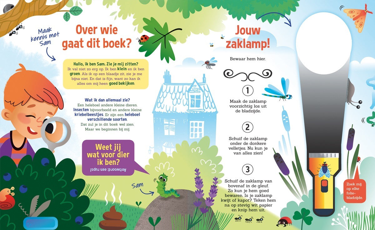 Rupsje Sam komt uit zijn ei gekropen en heeft enorme honger. Hij zoekt de beste plekjes op om zijn buik te vullen. Ga je met hem mee op pad en ontdek je samen met Sam alle insecten en andere kriebelbeestjes die in dit boek voorkomen? Het boek begint met leuke weetjes en feitjes over insecten. Hier kom je ook de kartonnen zaklamp tegen. Deze zaklamp heb je nodig voor de pagina's die volgen. In het verhaal staan namelijk gekleurde woorden, die je op de rechterpagina kunt zoeken. Maar dat lukt alleen als je de zaklamp gebruikt! Schuif 'm onder de zwarte pagina en je ziet dat er een lichtbundel ontstaat, waarmee je kunt zien wat Sam allemaal tegenkomt. Bekijk je ook de andere titels in deze serie?