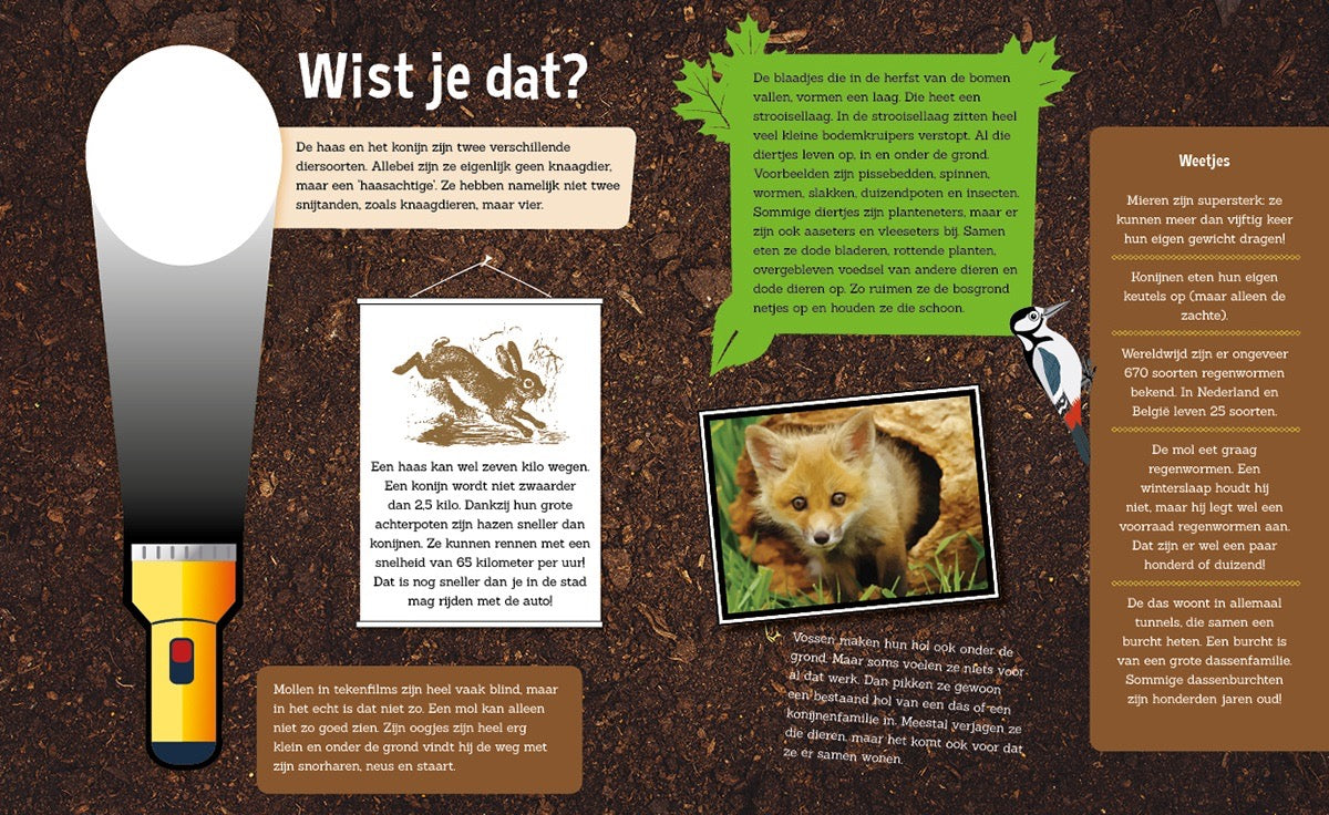 Ga je mee speuren onder de grond? Pak je zaklamp, dan gaan we eens kijken wie er allemaal leven onder de takjes en blaadjes in het bos, onder een dunne of juist een heel dikke laag aarde. Het boek begint met leuke weetjes en feitjes over dieren die onder de grond leven. Hier kom je ook de kartonnen zaklamp tegen. Deze zaklamp heb je nodig voor de pagina's die volgen. In het verhaal staan namelijk gekleurde woorden, die je op de rechterpagina kunt zoeken. Maar dat lukt alleen als je de zaklamp gebruikt! Schuif 'm onder de zwarte pagina en je ziet dat er een lichtbundel ontstaat, zodat je kunt zien wat er allemaal onder de grond gebeurt. Bekijk je ook de andere titels in deze serie?