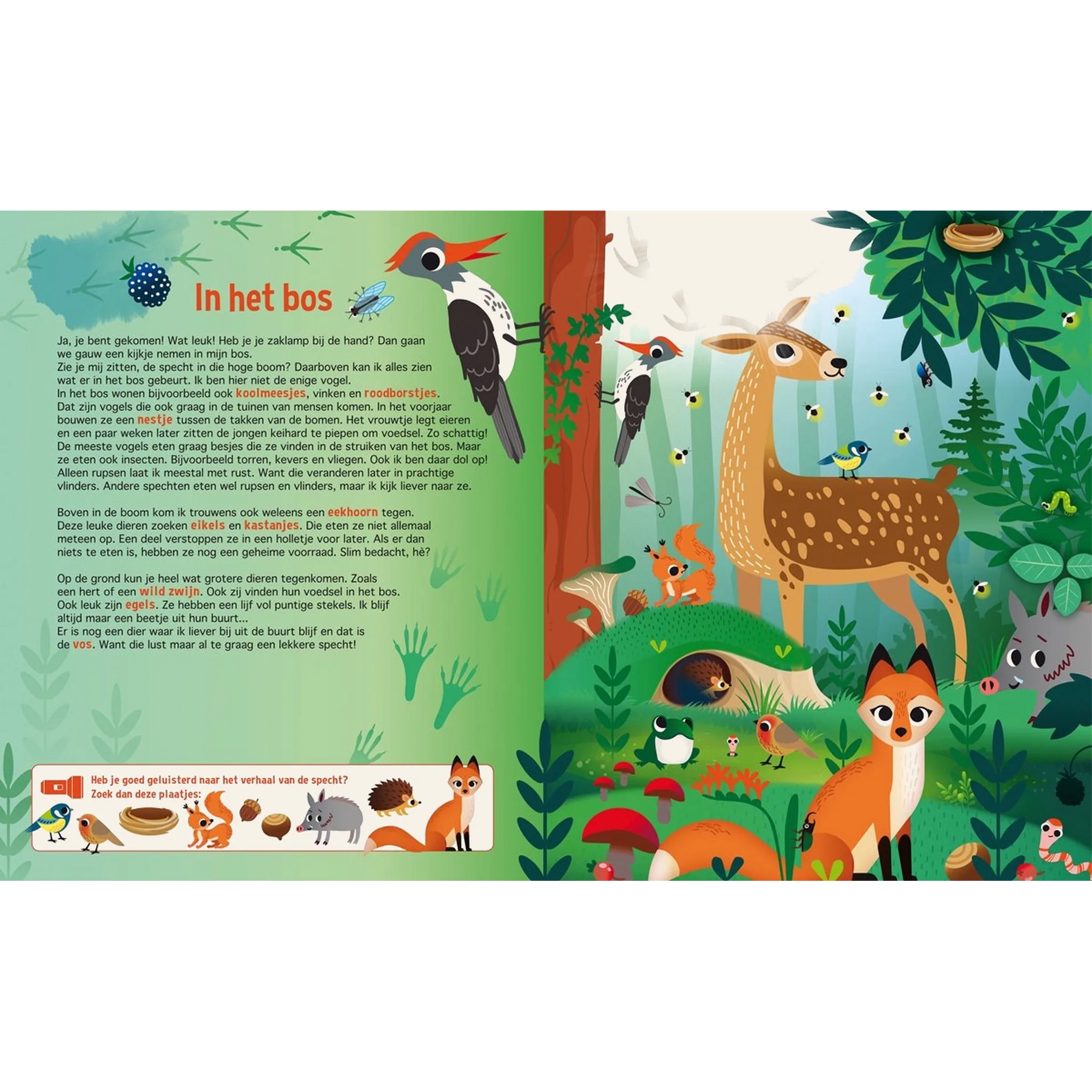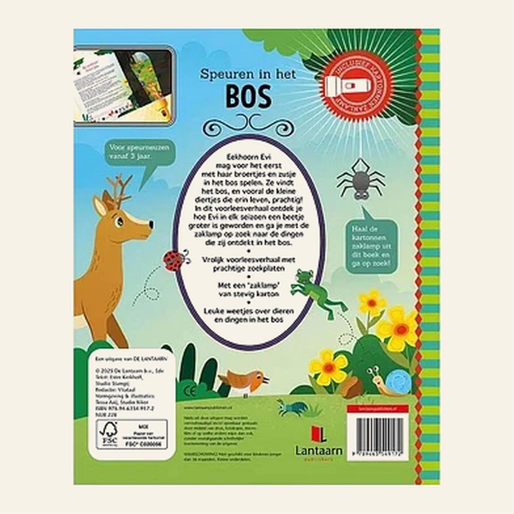 Eekhoorn Evi mag voor het eerst met haar broertjes en zusje in het bos spelen. Wat is er veel te ontdekken! Ieder seizoen ziet het bos er anders uit. Ga jij met Evi mee op avontuur? Het boek begint met leuke weetjes en feitjes over het bos. Hier kom je ook de kartonnen zaklamp tegen. Deze zaklamp heb je nodig voor de pagina's die volgen. In het verhaal staan namelijk gekleurde woorden, die je op de rechterpagina kunt zoeken. Maar dat lukt alleen als je de zaklamp gebruikt! Schuif 'm onder de zwarte pagina en je ziet dat er een lichtbundel ontstaat, waarmee je kunt zien wat Evi allemaal tijdens haar reis tegenkomt. Bekijk je ook de andere titels in deze serie?"